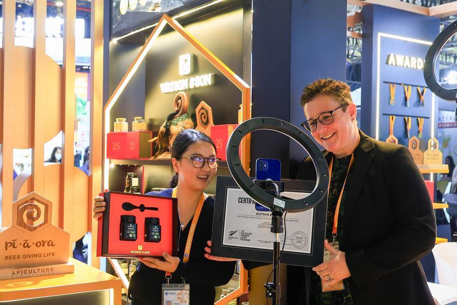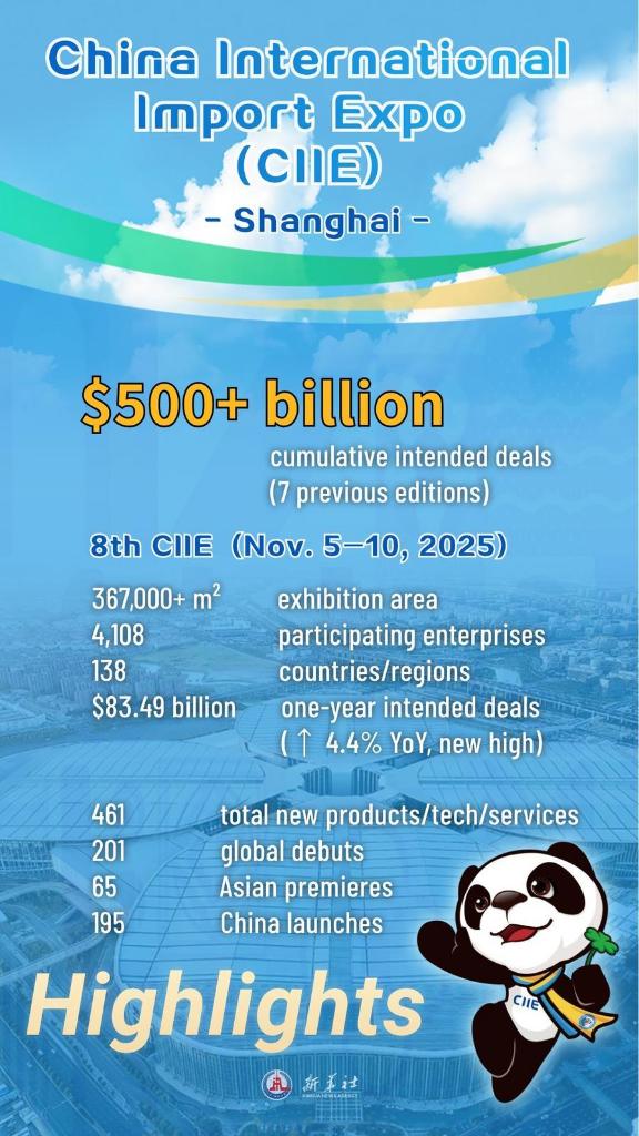 This photo taken on Nov. 3, 2025 shows a themed-decoration of the China International Import Expo (CIIE) at the National Exhibition and Convention Center (Shanghai) in east China’s Shanghai. (Xinhua/Fang Zhe)Staff members perform at the pavilion of the United Arab Emirates during the eighth China International Import Expo (CIIE) in east China’s Shanghai, Nov. 7, 2025. (Xinhua/Ren Pengfei)This photo shows a yoga event for one hundred participants organized by Lululemon outside the Consumer Goods Exhibition area during the eighth China International Import Expo (CIIE) in east China’s Shanghai, Nov. 8, 2025. (Xinhua/Du Xinyi)Visitors view Tesla’s Cybercab, which made its Asia-Pacific debut during the eighth China International Import Expo (CIIE) in east China’s Shanghai, Nov. 6, 2025. (Xinhua/Fang Zhe)Visitors line up to taste Iberian ham from Spain at the Food and Agricultural Products exhibition area during the eighth China International Import Expo (CIIE) in east China’s Shanghai, on Nov. 7, 2025. (Xinhua/Tian Weiwei)Exhibitors conduct a live streaming event at the booth of a New Zealand honey brand at the Food and Agricultural Products exhibition area during the eighth China International Import Expo (CIIE) in east China’s Shanghai, on Nov. 6, 2025. (Xinhua/Liu Jiaqi)