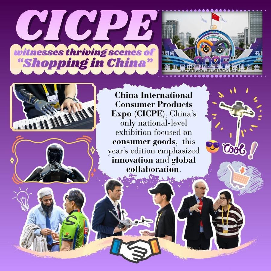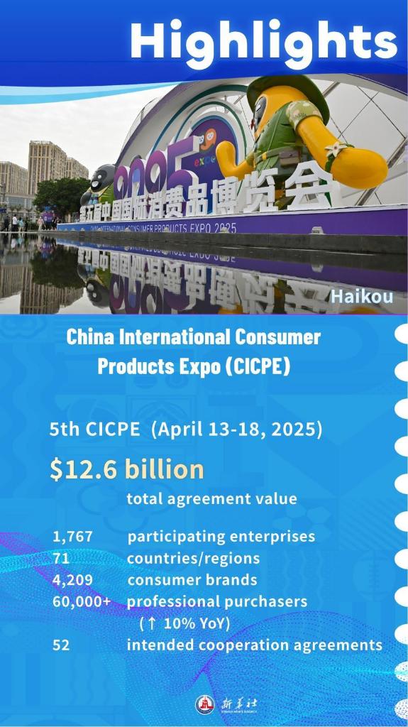 People visit the 5th China International Consumer Products Expo (CICPE) in Haikou, south China’s Hainan Province, April 17, 2025. (Xinhua/Zhang Liyun)Visitors try specialties of Harbin at the 5th China International Consumer Products Expo (CICPE) in Haikou, south China’s Hainan Province, April 16, 2025. (Xinhua/Zhang Liyun)An exhibitor from Uzbekistan introduces products to a visitor at the 5th China International Consumer Products Expo (CICPE) in Haikou, south China’s Hainan Province, April 17, 2025. (Xinhua/Guo Cheng)Visitors select Malaysian products at the 5th China International Consumer Products Expo (CICPE) in Haikou, south China’s Hainan Province, April 15, 2025. (Xinhua/Yang Guanyu)A staff member introduces a product to a visitor at the booth of DJI at the 5th China International Consumer Products Expo (CICPE) in Haikou, south China’s Hainan Province, April 15, 2025. (Xinhua/Sun Xiaotian)An exhibitor plays piano with a smart prosthetic hand at the 5th China International Consumer Products Expo (CICPE) in Haikou, south China’s Hainan Province, April 13, 2025. (Xinhua/Yang Guanyu)