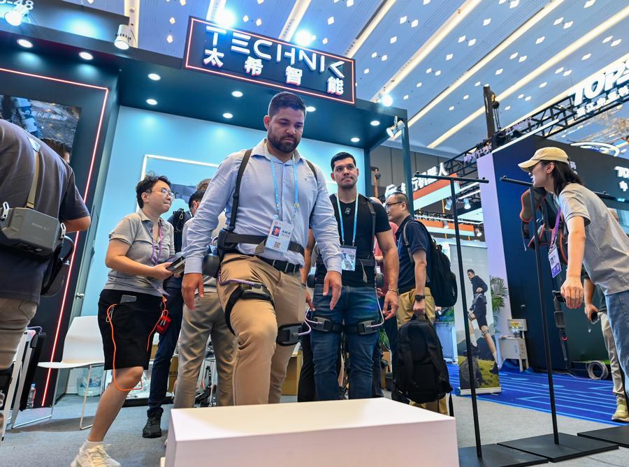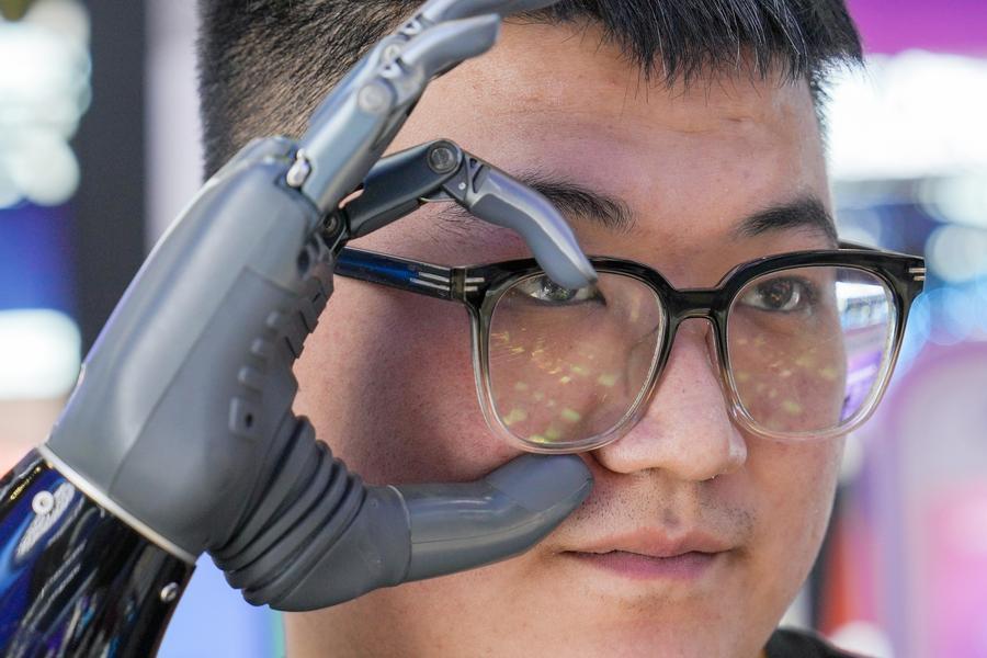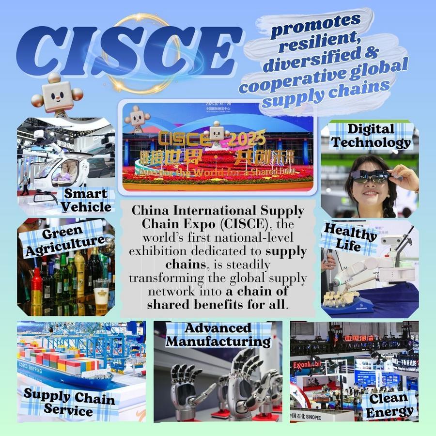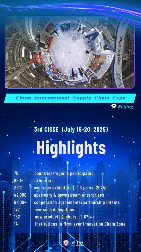 A visitor tries a pair of glasses at the booth of TCL in the Digital Technology Chain area of the third China International Supply Chain Expo (CISCE) in Beijing, capital of China, July 19, 2025. (Xinhua/Ju Huanzong)A visitor learns about products at the booth of Starbucks in the Healthy Life Chain area of the third China International Supply Chain Expo (CISCE) in Beijing, capital of China, July 19, 2025. (Xinhua/Chen Shuo)This photo taken on July 17, 2025 shows robots at the booth of Nvidia during the third China International Supply Chain Expo (CISCE) in Beijing, capital of China. (Xinhua/Ding Hongfa)Visitors from Nigeria learn about agricultural products at the pavilion of Thailand during the third China International Supply Chain Expo (CISCE) in Beijing, capital of China, July 17, 2025. (Xinhua/Jin Liwang)A staff member of technology firm BrainCo uses a smart prosthetic hand to take off his glasses in the Digital Technology Chain area of the third China International Supply Chain Expo (CISCE) in Beijing, capital of China, July 17, 2025. (Xinhua/Ju Huanzong)A visitor poses for photos with a tractor at the booth of China National Machinery Industry Corporation (Sinomach) in the Green Agriculture Chain area of the third China International Supply Chain Expo (CISCE) in Beijing, capital of China, July 16, 2025. (Xinhua/Wang Jingyi)