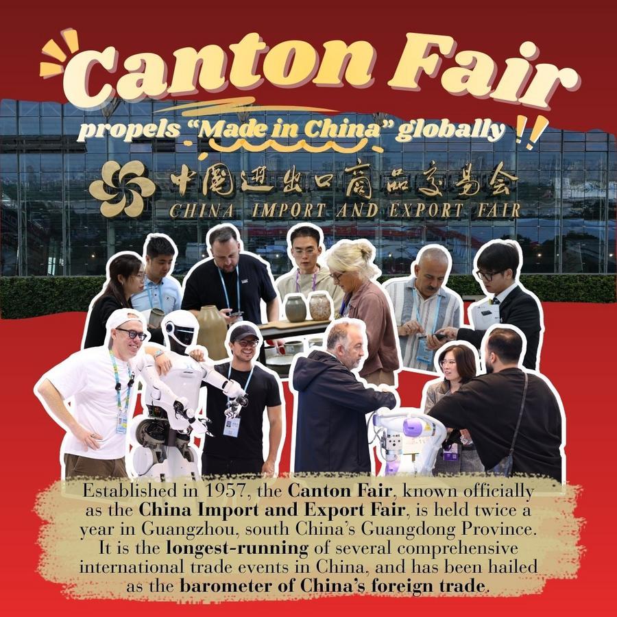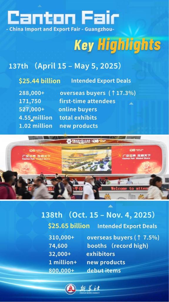 A man poses for a photo outside the venue of the 137th edition of the China Import and Export Fair in Guangzhou, south China’s Guangdong Province, April 15, 2025. (Xinhua/Deng Hua)This photo taken on Oct. 15, 2025 shows a scene during the 138th edition of the China Import and Export Fair in Guangzhou, south China’s Guangdong Province. (Xinhua/Deng Hua)Purchasers talk with an exhibitor at a garment booth at the 137th China Import and Export Fair in Guangzhou, south China’s Guangdong Province, May 5, 2025. (Xinhua/Huang Guobao)Purchasers attend the 137th China Import and Export Fair in Guangzhou, south China’s Guangdong Province, May 5, 2025. (Xinhua/Huang Guobao)Foreign buyers pose for a group photo with a humanoid robot at the service-robot zone during the 138th Canton Fair in Guangzhou, south China’s Guangdong Province, Oct. 15, 2025. (Xinhua/Lu Hanxin)A foreign purchaser tries an exoskeleton robot for mountain climbing at the booth of Hangzhou Technik Technology Co., Ltd. at the Service Robots Zone during the 138th edition of the China Import and Export Fair (Canton Fair) in Guangzhou, south China’s Guangdong Province, Oct. 15, 2025. (Xinhua/Xiao Ennan)