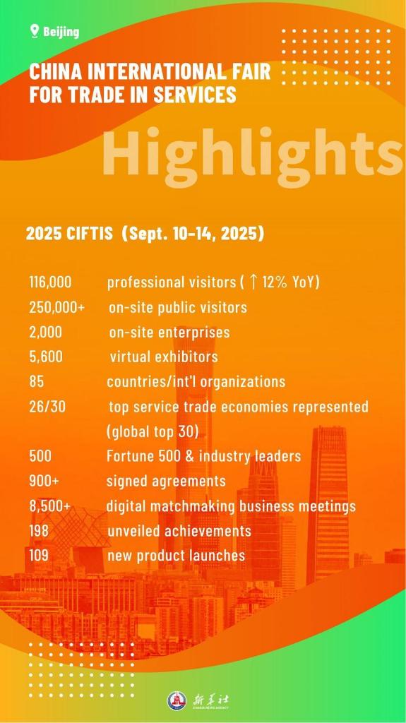 The Global Trade in Services Summit of the 2025 China International Fair for Trade in Services (CIFTIS) is held in Beijing, capital of China, Sept. 10, 2025. (Xinhua/Chen Yehua)People visit the Health Services exhibition area during the 2025 China International Fair for Trade in Services (CIFTIS) at Shougang Park in Beijing, capital of China, Sept. 14, 2025. (Xinhua/Xu Qin)People view the models on the booth of China National Offshore Oil Corporation (CNOOC) at the Environmental Services exhibition area during the 2025 China International Fair for Trade in Services (CIFTIS) at Shougang Park in Beijing, capital of China, Sept. 14, 2025. (Xinhua/Chang Nengjia)People play Go game, known as Weiqi in Chinese, with robots at the Cultural & Tourism Services exhibition area of the 2025 China International Fair for Trade in Services (CIFTIS) at Shougang Park in Beijing, capital of China, Sept. 13, 2025. (Xinhua/Xu Qin)Visitors experience VR skiing during the 2025 China International Fair for Trade in Services (CIFTIS) in Beijing, capital of China, Sept. 10, 2025. (Xinhua/Chang Nengjia)Students try electronic ink screens during the 2025 China International Fair for Trade in Services (CIFTIS) in Beijing, capital of China, Sept. 10, 2025. (Xinhua/Zhang Chenlin)