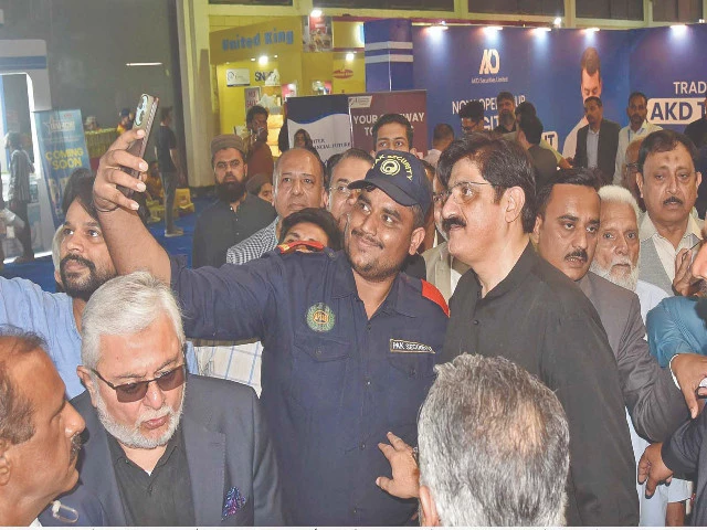 A security guard takes a selfie with CM Murad Ali Shah who was visiting various stalls at the My Karachi Expo on its concluding day. Photo: Express