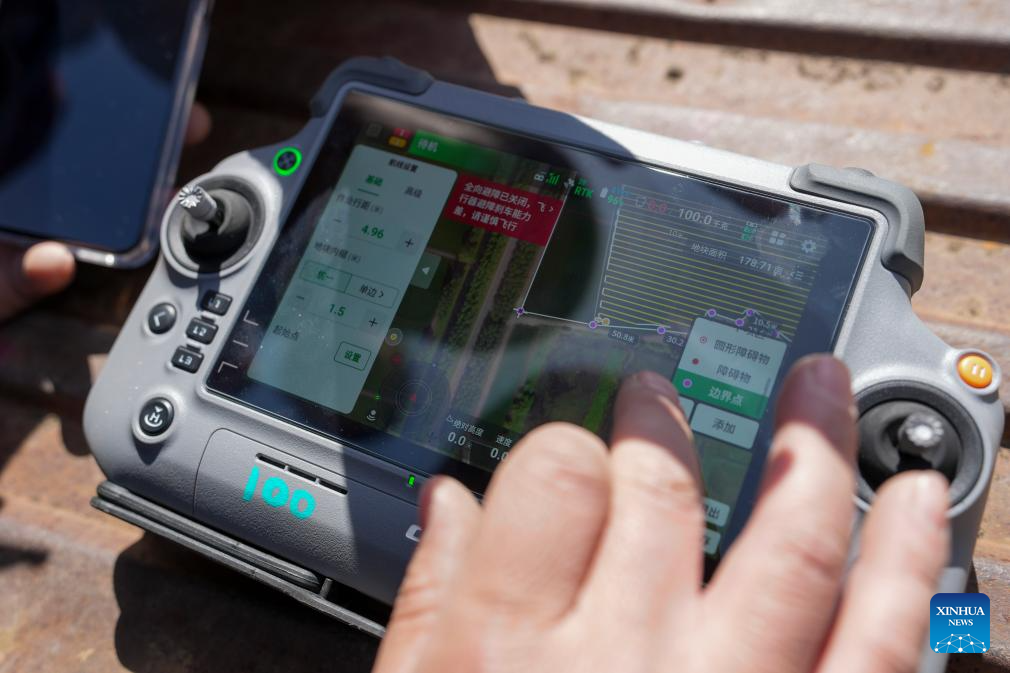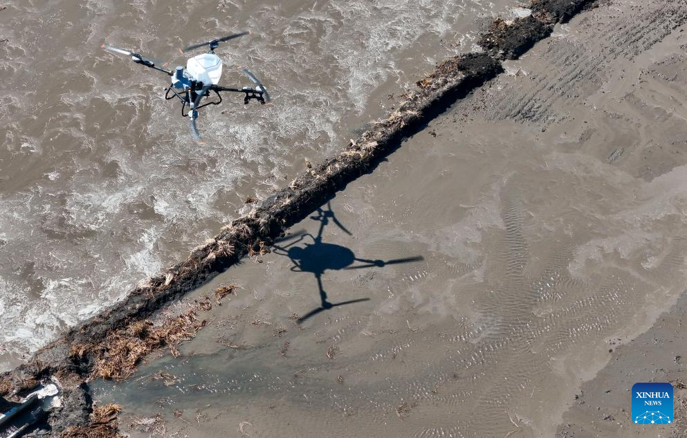 A farmer operates an agricultural drone to spray fertilizer onto paddy fields of Youyi Farm Co., Ltd. under Beidahuang Group in Shuangyashan, northeast China’s Heilongjiang Province, April 9, 2026. Heilongjiang, a major grain-producing area in China, has entered the spring ploughing season for rice. (Xinhua/Wang Song)