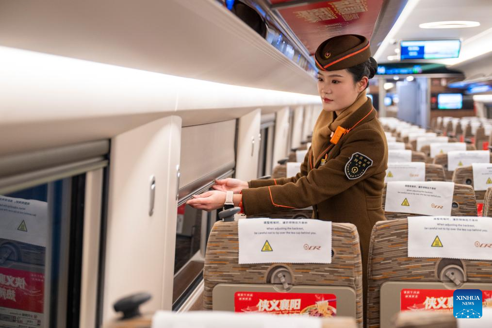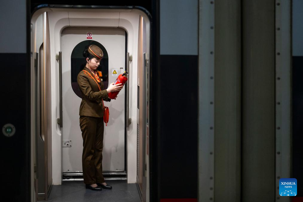 A train attendant checks fire extinguisher condition in a carriage of train No. G340 before departure at the Wuhan Railway Station in Wuhan, central China’s Hubei Province, on Jan. 26, 2026. A new nationwide train schedule has taken effect in China from Jan. 26, 2026 with improved passenger and freight transport capacity and efficiency. (Xinhua/Wu Zhizun)