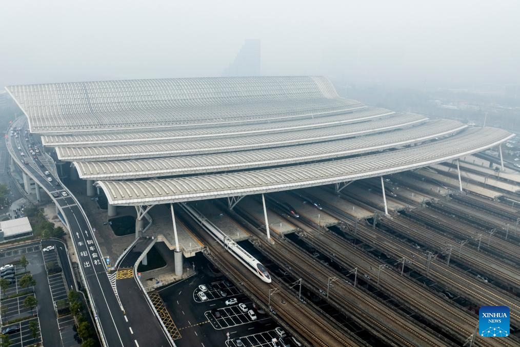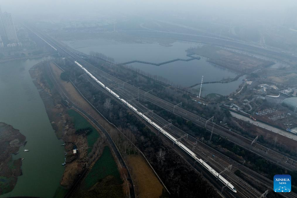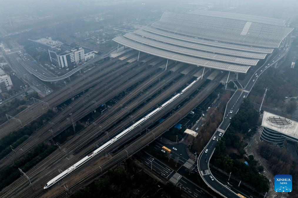 An aerial drone photo taken on Jan. 26, 2026 shows a train departing the Wuhan Railway Station in Wuhan, central China’s Hubei Province. A new nationwide train schedule has taken effect in China from Jan. 26, 2026 with improved passenger and freight transport capacity and efficiency. (Xinhua/Wu Zhizun)