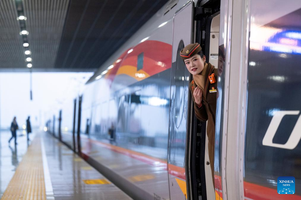The conductor of train No. G340 prepares for departure at the Wuhan Railway Station in Wuhan, central China’s Hubei Province, on Jan. 26, 2026. A new nationwide train schedule has taken effect in China from Jan. 26, 2026 with improved passenger and freight transport capacity and efficiency. (Xinhua/Wu Zhizun)