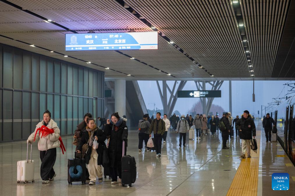 Passengers board train No. G340 at the Wuhan Railway Station in Wuhan, central China’s Hubei Province, on Jan. 26, 2026. A new nationwide train schedule has taken effect in China from Jan. 26, 2026 with improved passenger and freight transport capacity and efficiency. (Xinhua/Wu Zhizun)