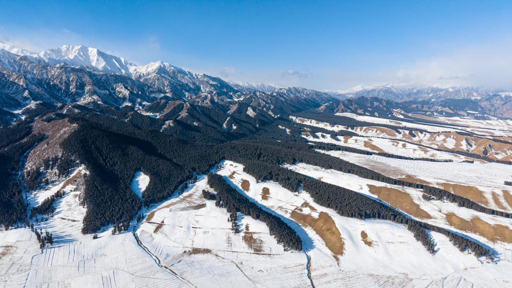 A drone photo taken on Jan. 15, 2025 shows the snow scenery of Qilian Mountains in Tianzhu County of Wuwei City, northwest China’s Gansu Province. (Xinhua/Lang Bingbing)
