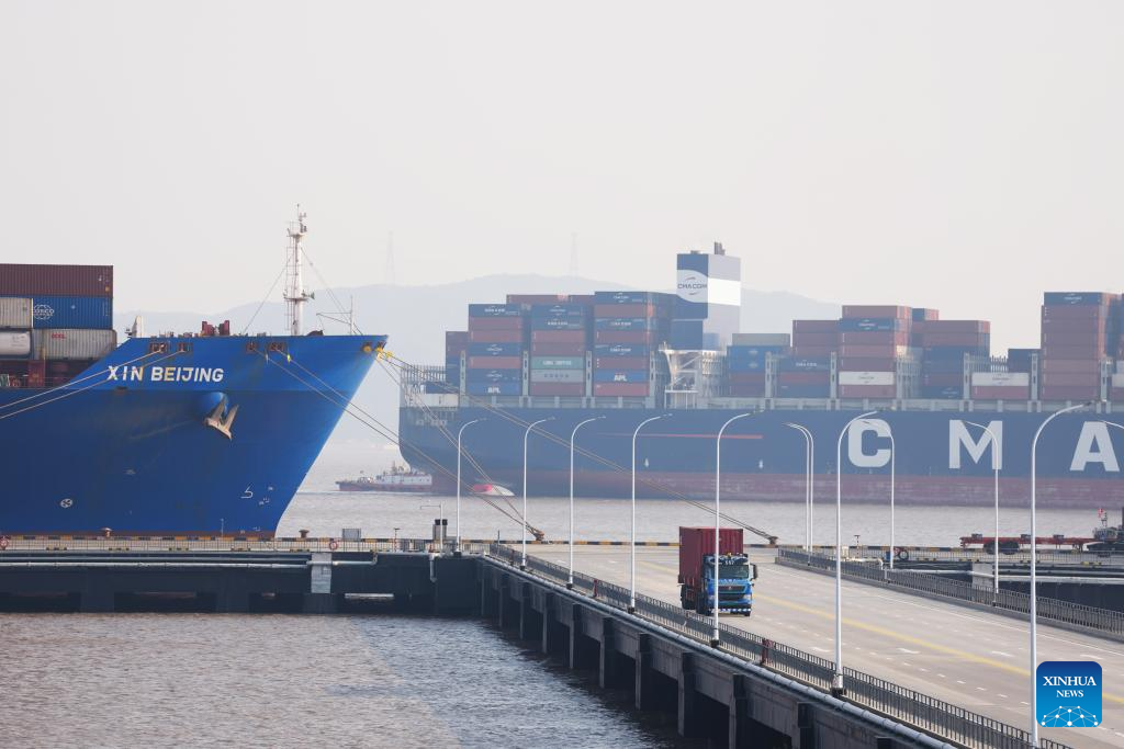 A cargo ship (L) berths at the Meishan area of Ningbo-Zhoushan Port, east China’s Zhejiang Province, on Jan. 8, 2026. The Ningbo-Zhoushan Port saw its cargo throughput surpassing 1.4 billion tonnes in 2025, ranking the first globally for the 17th consecutive year, according to the port.