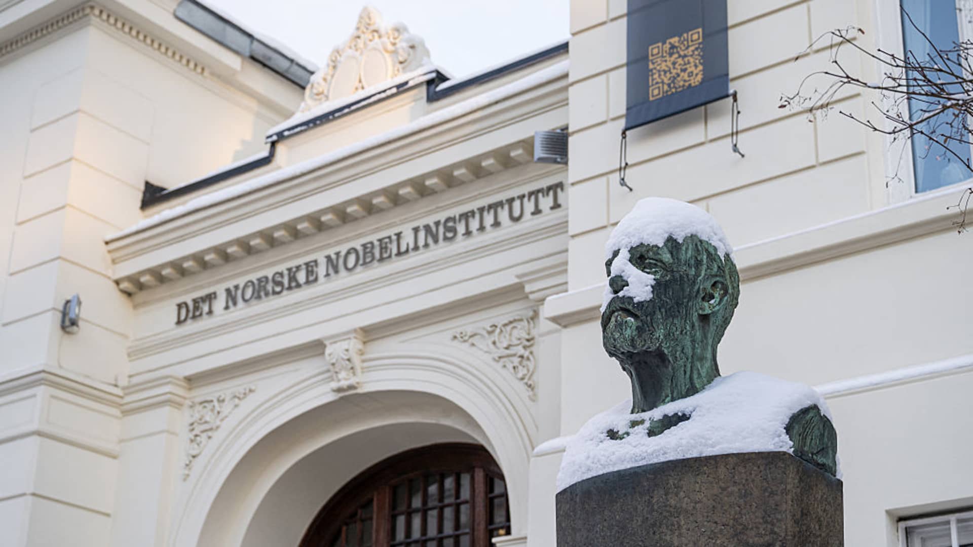 A bust of Swedish chemist, engineer, inventor, businessman, and philanthropist Alfred Nobel (1833-1896) is pictured outside the Norwegian Nobel Institute in Oslo, Norway on January 8, 2026.