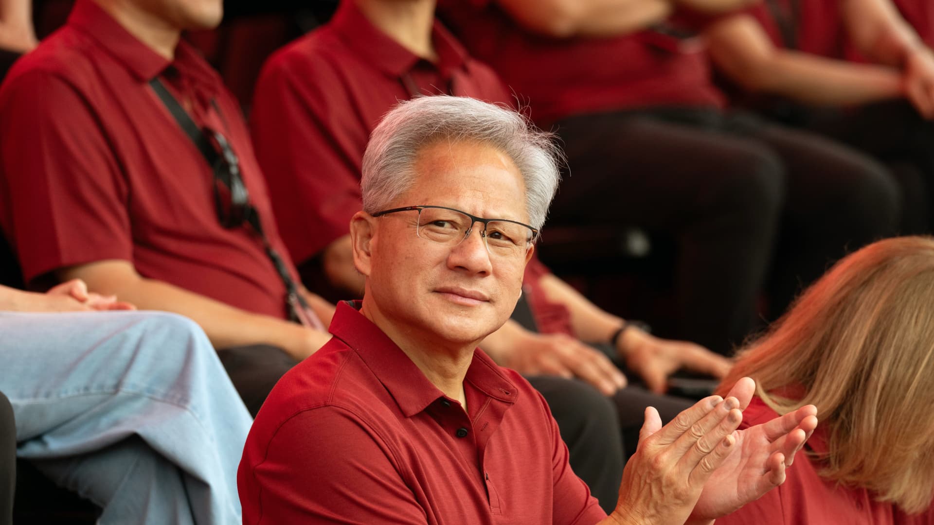 Jensen Huang, chief executive officer of Nvidia Corp., during the Taiwan Semiconductor Manufacturing Co. (TSMC) sports day event in Hsinchu, Taiwan, on Saturday, Nov. 8, 2025.