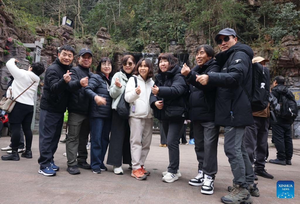 Malaysian tourists pose for group photos at Zhangjiajie National Forest Park in central China’s Hunan Province, Jan. 2, 2026. (Photo by Wu Yongbing/Xinhua)