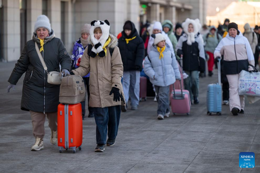 Foreign tourists walk out of Suifenhe Railway Station in Suifenhe, northeast China’s Heilongjiang Province, on Jan. 8, 2026. (Xinhua/Zhang Tao)