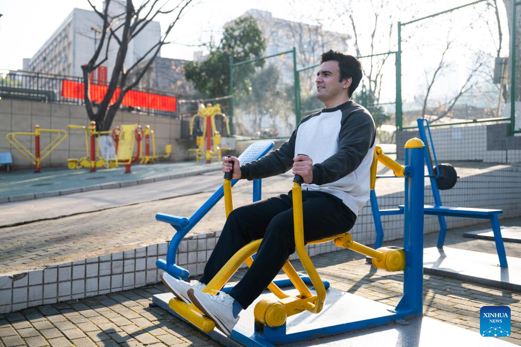 Mauri Joseph Tualaulelei from Samoa does physical exercise at Central China Normal University in Wuhan City, central China’s Hubei Province, Jan. 8, 2026. Tualaulelei is pursuing a master’s degree in Physical Education at the university. He has been in China since 2017. (Xinhua/Wu Zhizun)