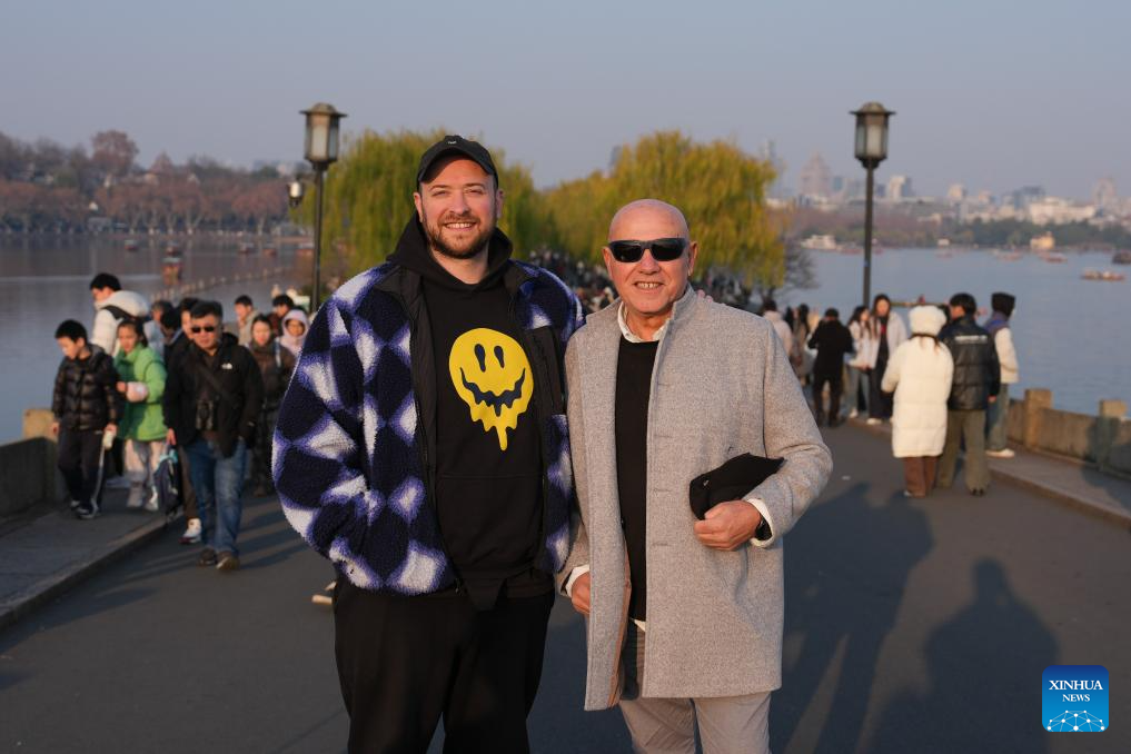 Spanish tourist Jose Vicente Guerrero (R, front) and his son Ander Guerrero pose for a photo at West Lake scenic area in Hangzhou, east China’s Zhejiang Province, Jan. 3, 2026. (Xinhua/Huang Zongzhi)