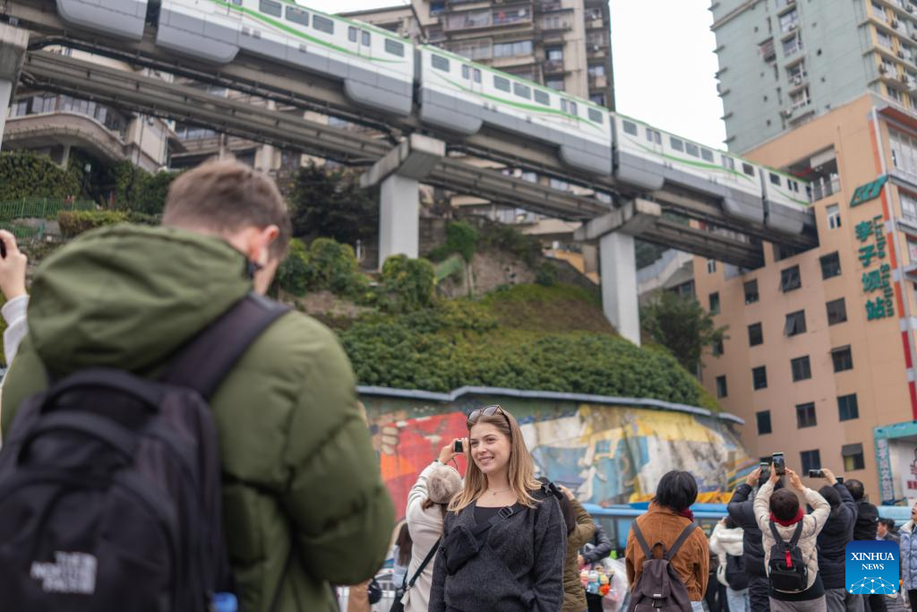 Foreign tourists take photos at a sightseeing platform of Liziba in Yuzhong District of southwest China’s Chongqing, Jan. 7, 2026. (Xinhua/Huang Wei)