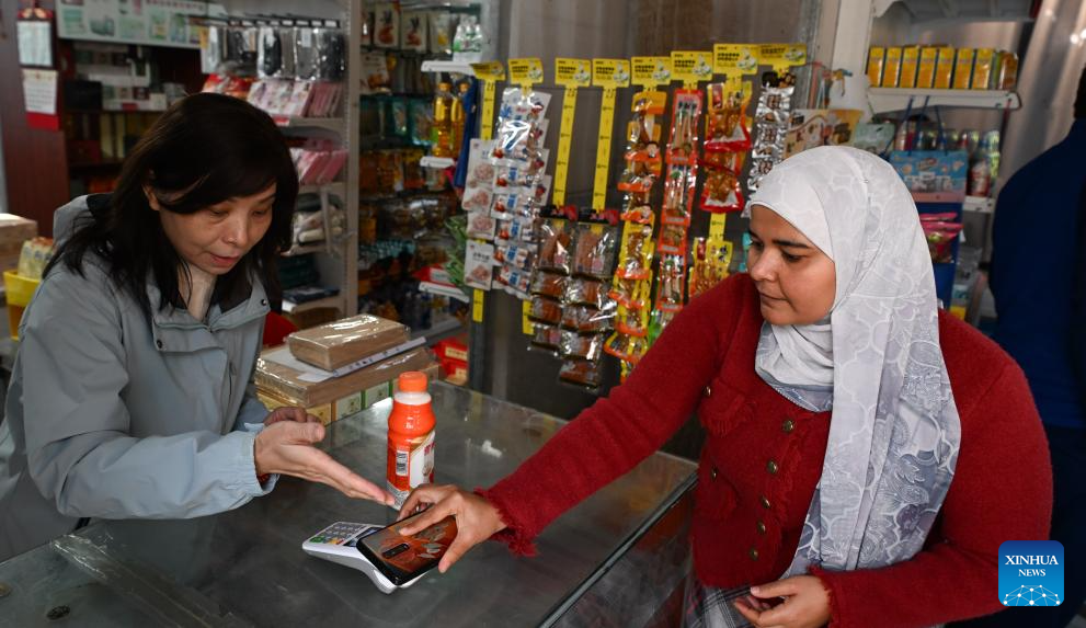 Fardous Muhammad Tawfik Abdelwanis (R) uses a mobile payment service at a grocery store in Haikou, south China’s Hainan Province, Jan. 7, 2026. Fardous Muhammad Tawfik Abdelwanis from Egypt is currently a researcher at the Chinese Academy of Tropical Agricultural Sciences in south China’s Hainan. (Xinhua/Yang Guanyu)