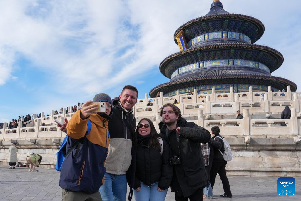 Mexican tourists and their tour guide (1st L) pose for photos at the Tiantan (Temple of Heaven) Park in Beijing, capital of China, Jan. 7, 2026. (Xinhua/Ju Huanzong)