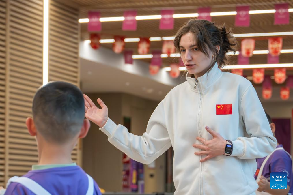 Zaparivannaia Mariia from Russia instructs young students at a fencing club in Wuhan, central China’s Hubei Province, Jan. 10, 2026. Zaparivannaia is a coach at a fencing club in Wuhan. (Xinhua/Du Zixuan)