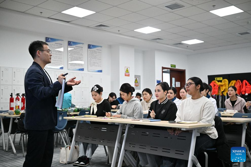 Students from Thailand’s Suan Dusit University learn the psychology of cabin service during an exchange activity at the Civil Aviation University of China in Tianjin, north China, Jan. 8, 2026. (Xinhua/Sun Fanyue)