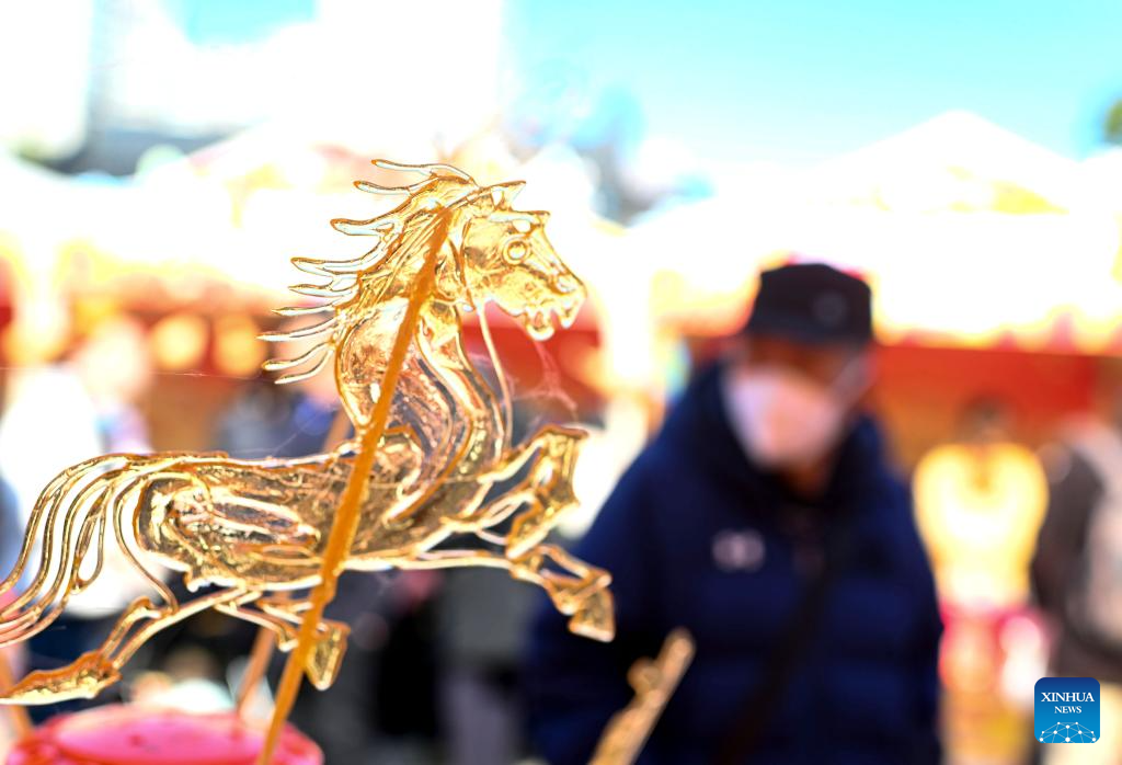 This photo taken on Jan. 23, 2026 shows a horse-shaped syrup craft displayed during a fair for New Year supplies at a park in Nanjing City, east China’s Jiangsu Province. Chinese people are busy preparing fresh flowers, Chinese knots, spring couplets, and other traditional necessities to celebrate the upcoming Spring Festival, or the Chinese New Year. (Photo by Yang Suping/Xinhua)