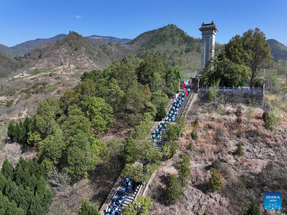 An aerial drone photo taken on March 31, 2026 shows teachers and students paying tribute to martyrs at a martyrs’ cemetery in Bozhou District of Zunyi City, southwest China’s Guizhou Province. People across the country attended various activities to pay tribute to martyrs ahead of the Qingming Festival, or Tomb-Sweeping Day, which falls on April 5 this year. (Photo by Yuan Fuhong/Xinhua)