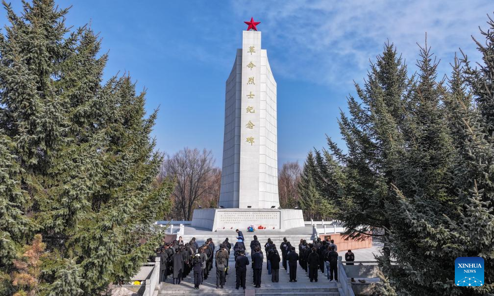 An aerial drone photo taken on April 1, 2026 shows people paying tribute to martyrs at a monument to martyrs in Suifenhe City, northeast CHina’s Heilongjiang Province. People across the country attended various activities to pay tribute to martyrs ahead of the Qingming Festival, or Tomb-Sweeping Day, which falls on April 5 this year. (Photo by Qu Yiwei/Xinhua)