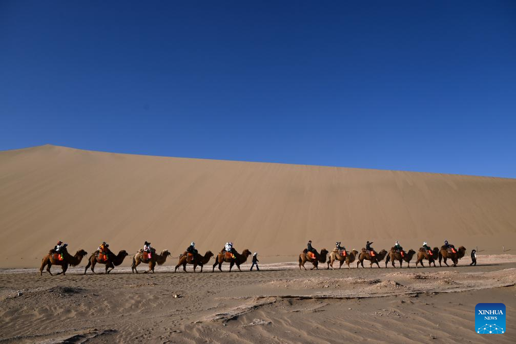 Tourists visit the Mingsha Mountain and Crescent Spring Scenic Area during the Qingming Festival holiday in Dunhuang City, northwest China’s Gansu Province, April 4, 2026. (Photo by Zhang Xiaoliang/Xinhua)