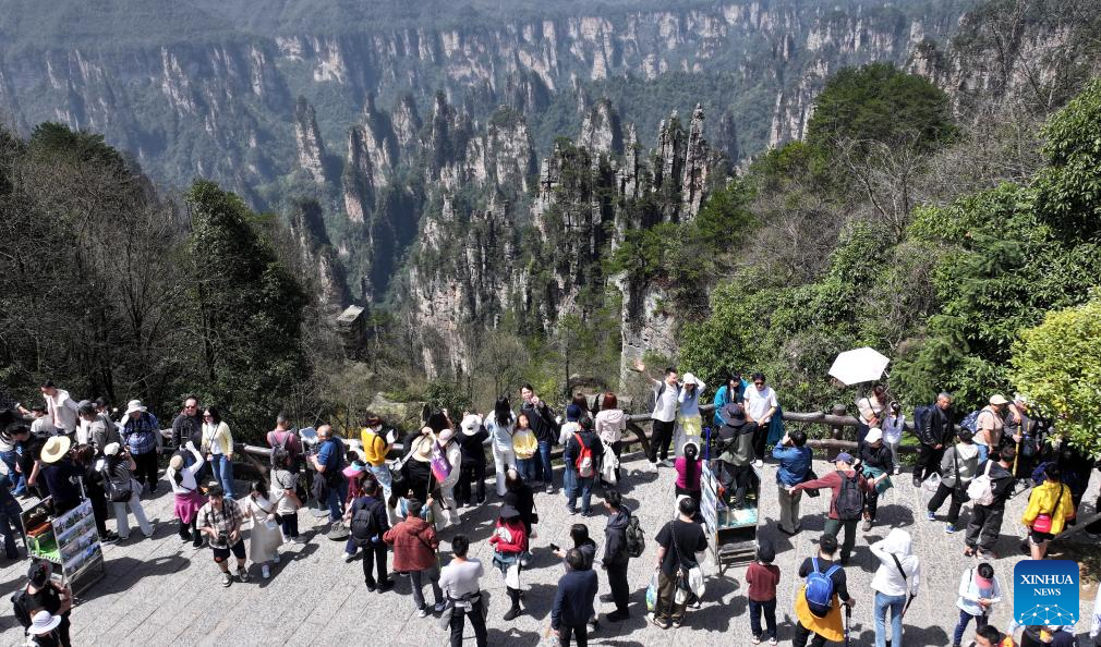 An aerial drone photo taken on April 4, 2026 shows tourists visiting Zhangjiajie National Forest Park during the Qingming Festival holiday in Zhangjiajie, central China’s Hunan Province. (Photo by Wu Yongbing/Xinhua)