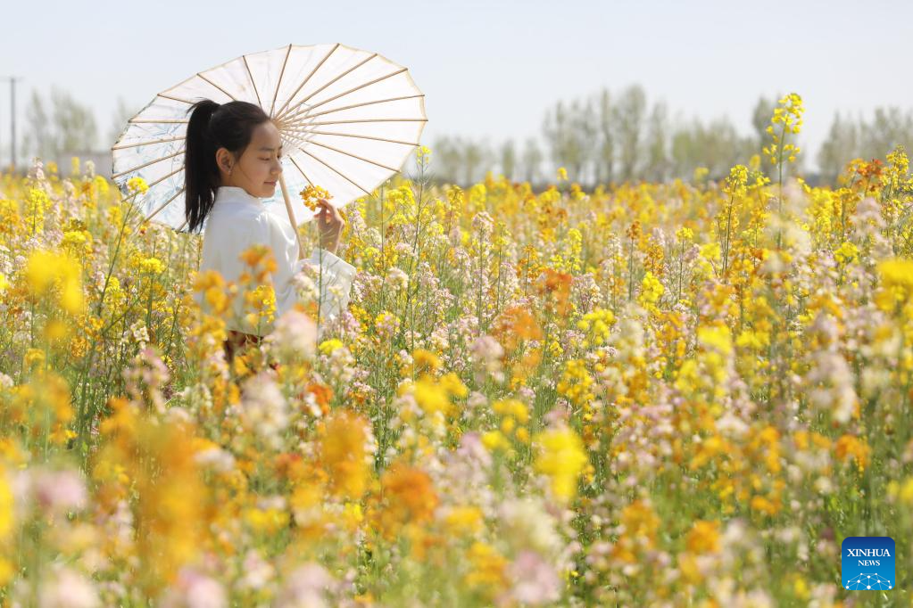 A tourist poses for a photo in a cole flower field during the Qingming Festival holiday in Wenxian County of Jiaozuo, central China’s Henan Province, April 4, 2026. (Photo by Xu Hongxing/Xinhua)