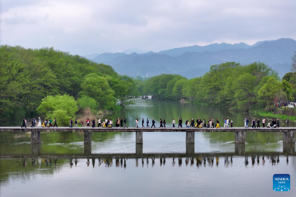A drone photo taken on April 4, 2026 shows tourists visiting a wetland during the Qingming Festival holiday in Huangshan City, east China’s Anhui Province. (Photo by Fan Chengzhu/Xinhua)