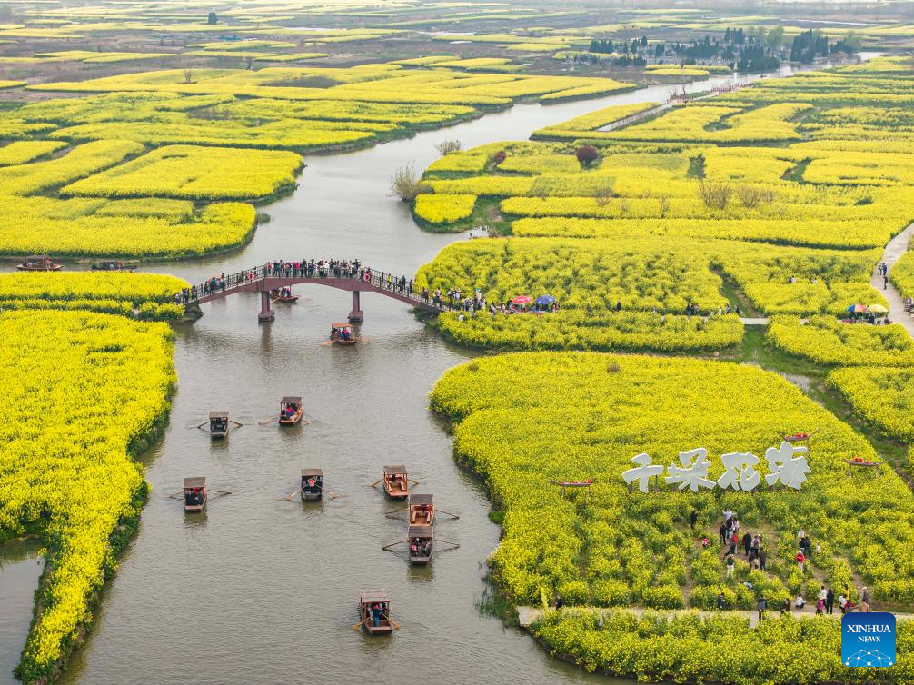 An aerial drone photo taken on April 4, 2026 shows people taking a boat for sightseeing at a flower-themed scenic area during the Qingming Festival holiday in Gaoyou City, east China’s Jiangsu Province. (Photo by Zhou Shegen/Xinhua)