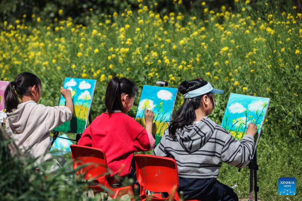 Children sketch at a park during the Qingming Festival holiday in Boai County of Jiaozuo City, central China’s Henan Province, April 4, 2026. (Photo by Cheng Quan/Xinhua)