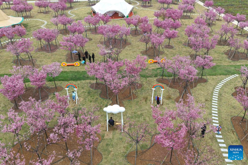 An aerial drone photo taken on March 21, 2026 shows people enjoying themselves among blooming flowers at a scenic area in Nanma Town of Dongyang City, east China’s Zhejiang Province. People step outdoors and embrace nature as spring unfolds across China. (Photo by Bao Kangxuan/Xinhua)