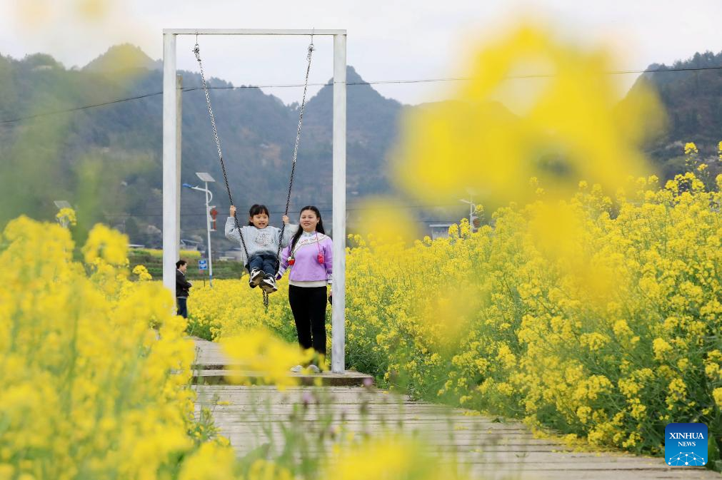 A child enjoys swing at Shangwengshao Village in Qiandongnan Miao and Dong Autonomous Prefecture, southwest China’s Guizhou Province, March 21, 2026. People step outdoors and embrace nature as spring unfolds across China. (Photo by Tai Shengzhi/Xinhua)