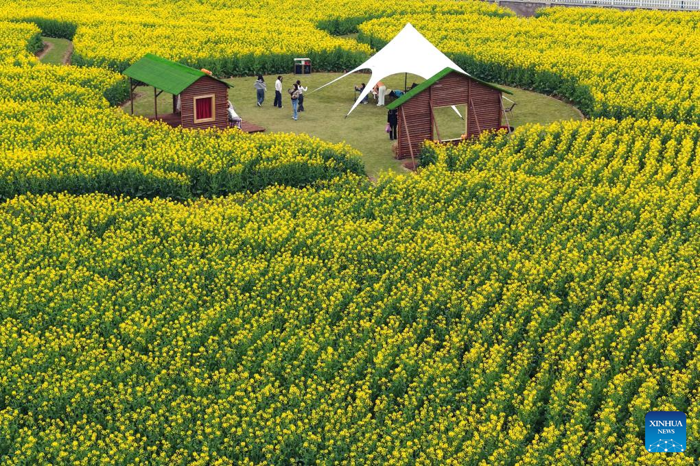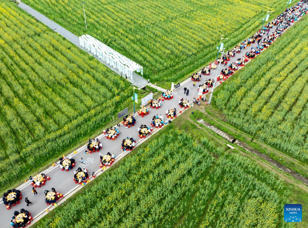 An aerial drone photo taken on March 21, 2026 shows people enjoying a banquet among rapeseed flowers fields in Huaqiao Town of Guang’an City, southwest China’s Sichuan Province. People step outdoors and embrace nature as spring unfolds across China. (Photo by Zhang Guosheng/Xinhua)