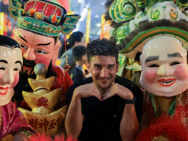 A man poses for a picture with lion dancers ahead of the Lunar New Year celebrations at a department store, in Bangkok, Thailand, February 15, 2026. REUTERS