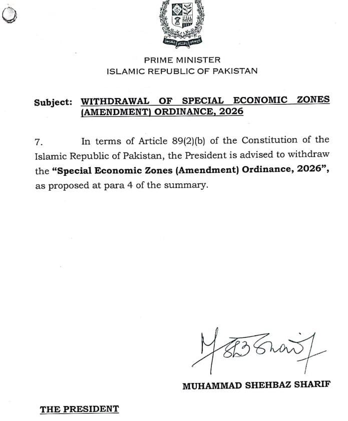 In an interesting turn of events, Prime Minister Shehbaz Sharif has sent a summary to President Asif Ali Zardari, advising the withdrawal of the Special Economic Zones (Amendment) Ordinance 2026.