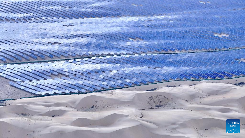 An aerial drone photo taken on May 17, 2025 shows a photovoltaic base with a capacity of one million kilowatts in Dalad Banner of Erdos, north China’s Inner Mongolia Autonomous Region. (Photo by Yang Yaozhong/Xinhua)