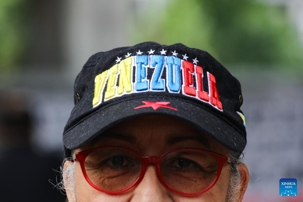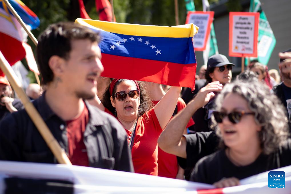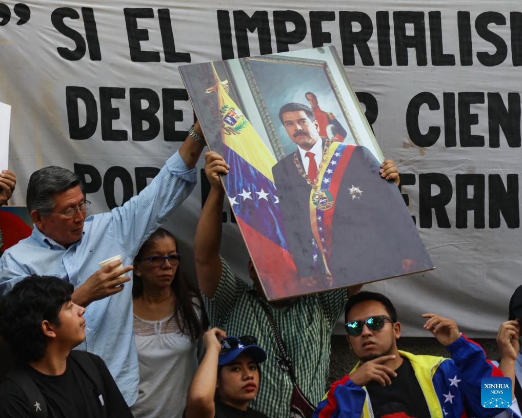 People in support of Venezuela protest outside the U.S. Embassy in Buenos Aires, Argentina, on Jan. 3, 2026. The U.S. military launched a series of attacks against Venezuela early Saturday morning, reportedly capturing Venezuelan President Nicolas Maduro and flying him out of the country. (Xinhua/Zhang Duo)