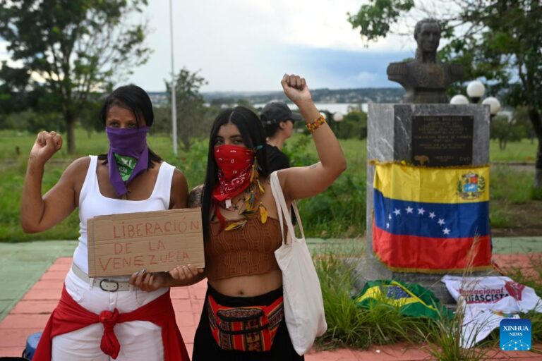 People in support of Venezuela hold a placard outside the Venezuelan Embassy in Brasilia, Brazil, on Jan. 3, 2026. The U.S. military launched a series of attacks against Venezuela early Saturday morning, reportedly capturing Venezuelan President Nicolas Maduro and flying him out of the country. (Photo by Lucio Tavora/Xinhua)