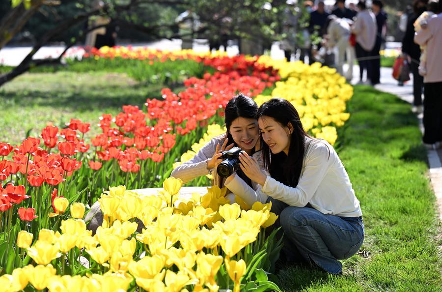 Tourists enjoy their leisure time at a botanical garden during the Qingming Festival holiday in Shijiazhuang, north China’s Hebei Province, April 4, 2026. (Photo by Chen Qibao/Xinhua)