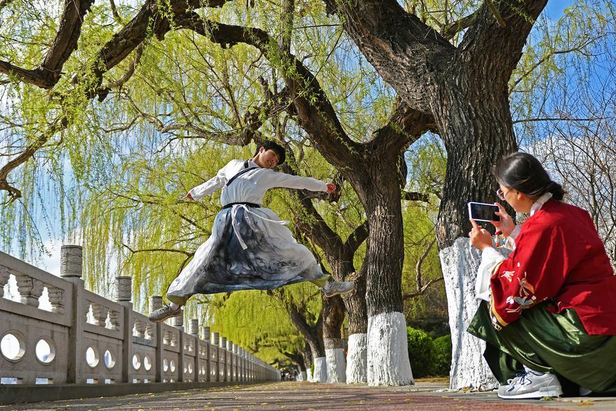A tourist in traditional Chinese attire poses for photos in Yantai, east China’s Shandong Province, April 4, 2026. (Photo by Sun Wentan/Xinhua)