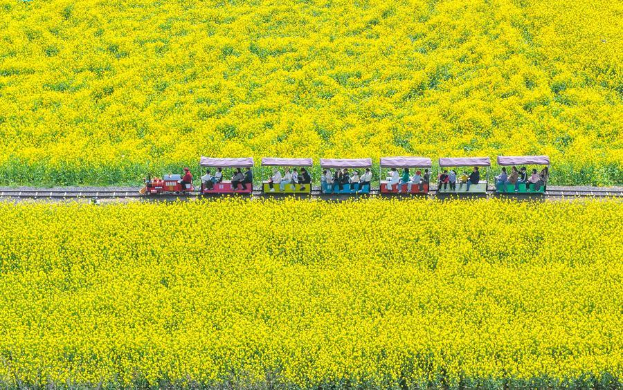 An aerial drone photo taken on April 4, 2026 shows people taking a train for sightseeing in a flower field during the Qingming Festival holiday in Xuyi County, east China’s Jiangsu Province. (Photo by Xu Changyin/Xinhua)