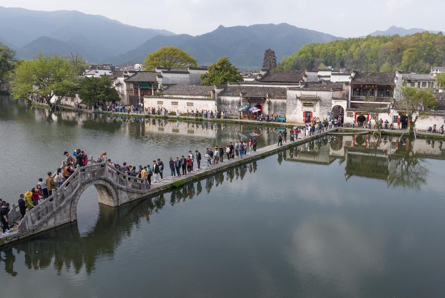 An aerial drone photo taken on April 4, 2026 shows visitors enjoying the scenery during the Qingming Festival holiday at Hongcun Village, Yixian County of Huangshan City, east China’s Anhui Province. (Xinhua/Du Yu)
