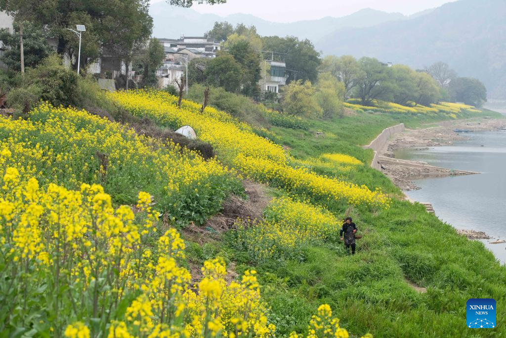 This photo taken on March 15, 2026 shows the scenery along the Xin’an River in Kengkou Township of Shexian County in Huangshan, east China’s Anhui Province. As spring unfolds, rapeseed flowers along the Xin’an River, a bio-diverse waterway which flows from Anhui to Zhejiang, have entered blooming season. (Xinhua/Zhang Duan)