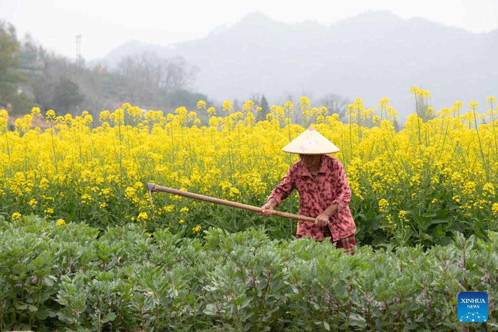 A villager works in a field in a village near the Xin’an River in Shexian County of Huangshan, east China’s Anhui Province, March 16, 2026. As spring unfolds, rapeseed flowers along the Xin’an River, a bio-diverse waterway which flows from Anhui to Zhejiang, have entered blooming season. (Xinhua/Zhang Duan)
