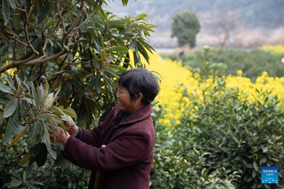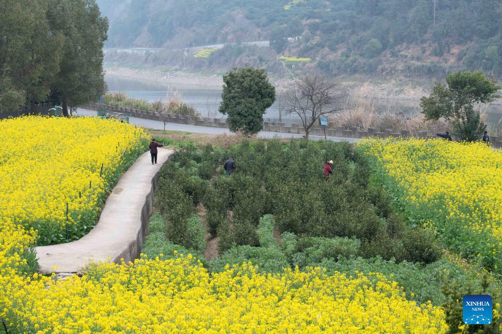 A villager tends a loquat tree near the Xin’an River in Kengkou Township of Shexian County in Huangshan, east China’s Anhui Province, March 15, 2026. As spring unfolds, rapeseed flowers along the Xin’an River, a bio-diverse waterway which flows from Anhui to Zhejiang, have entered blooming season. (Xinhua/Zhang Duan)
