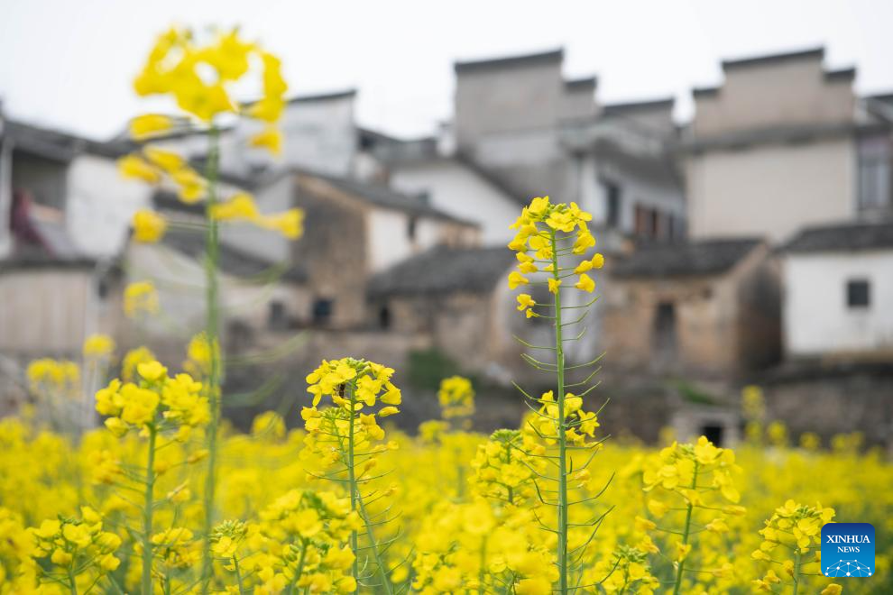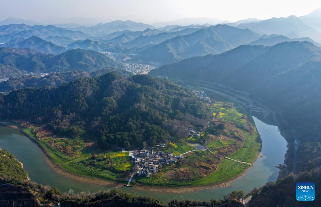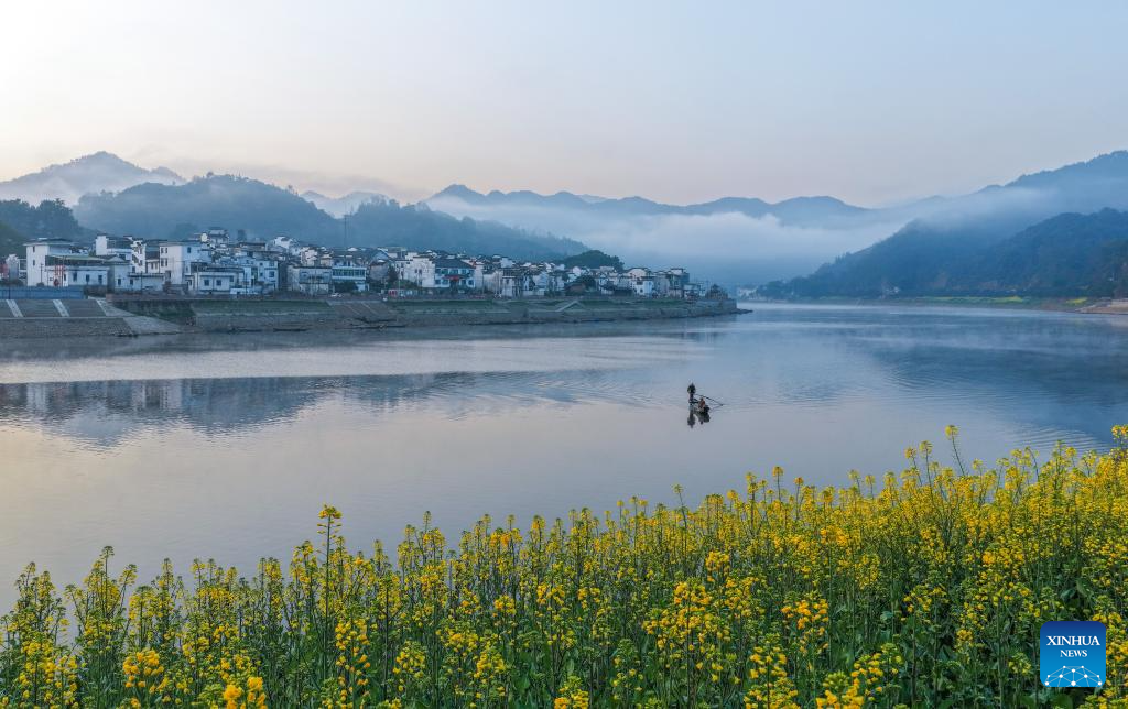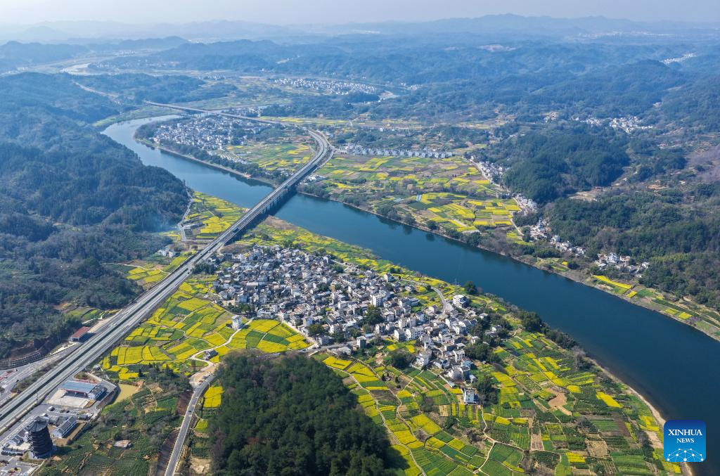 This photo taken on March 16, 2026 shows the scenery in a village near the Xin’an River in Shexian County of Huangshan, east China’s Anhui Province. As spring unfolds, rapeseed flowers along the Xin’an River, a bio-diverse waterway which flows from Anhui to Zhejiang, have entered blooming season. (Xinhua/Zhang Duan)