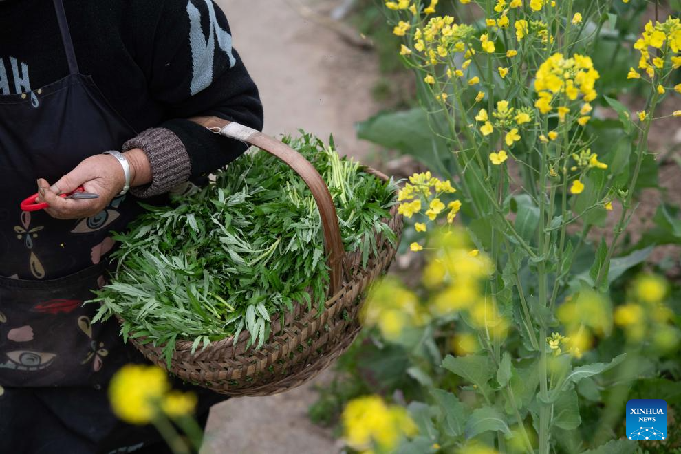 A villager carries edible wild plants near the Xin’an River in Kengkou Township of Shexian County in Huangshan, east China’s Anhui Province, March 15, 2026. As spring unfolds, rapeseed flowers along the Xin’an River, a bio-diverse waterway which flows from Anhui to Zhejiang, have entered blooming season. (Xinhua/Zhang Duan)